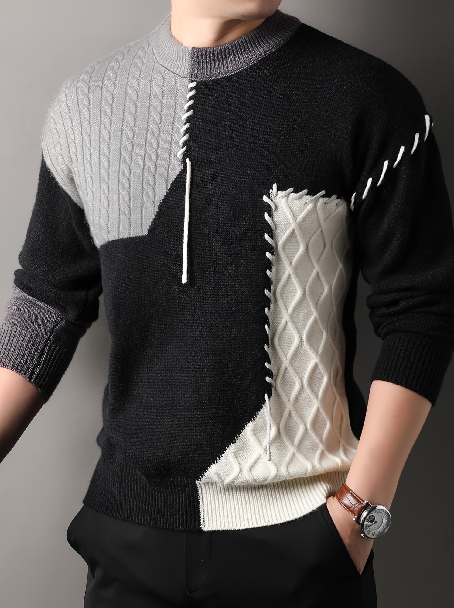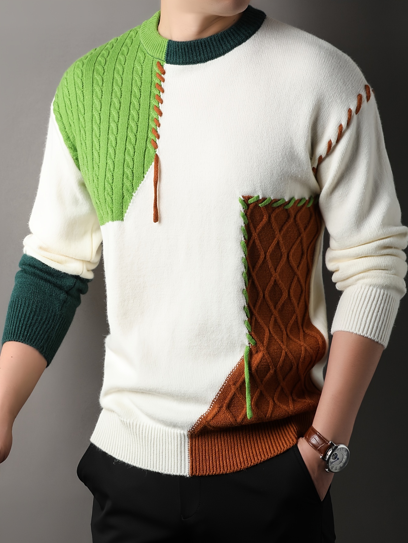 1pc Men'S Korean Style Crew Neck Sweater, Casual Striped Pattern, Rib-Knit, Slight Stretch, Loose Fit, Acrylic Knit Fabric, Thick Warm Patchwork Pullover for Fall/Winter - Fashionable Color Block Base Layer Top [12422]
