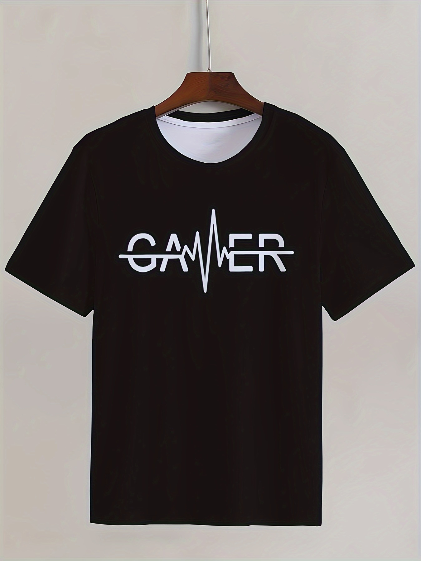 Men'S Casual Crew Neck T-Shirt with Geometric Gamer Pulse Graphic, 100% Polyester Knit Fabric, Slight Stretch, Regular Fit - Stylish Streetwear for Sports and Fitness