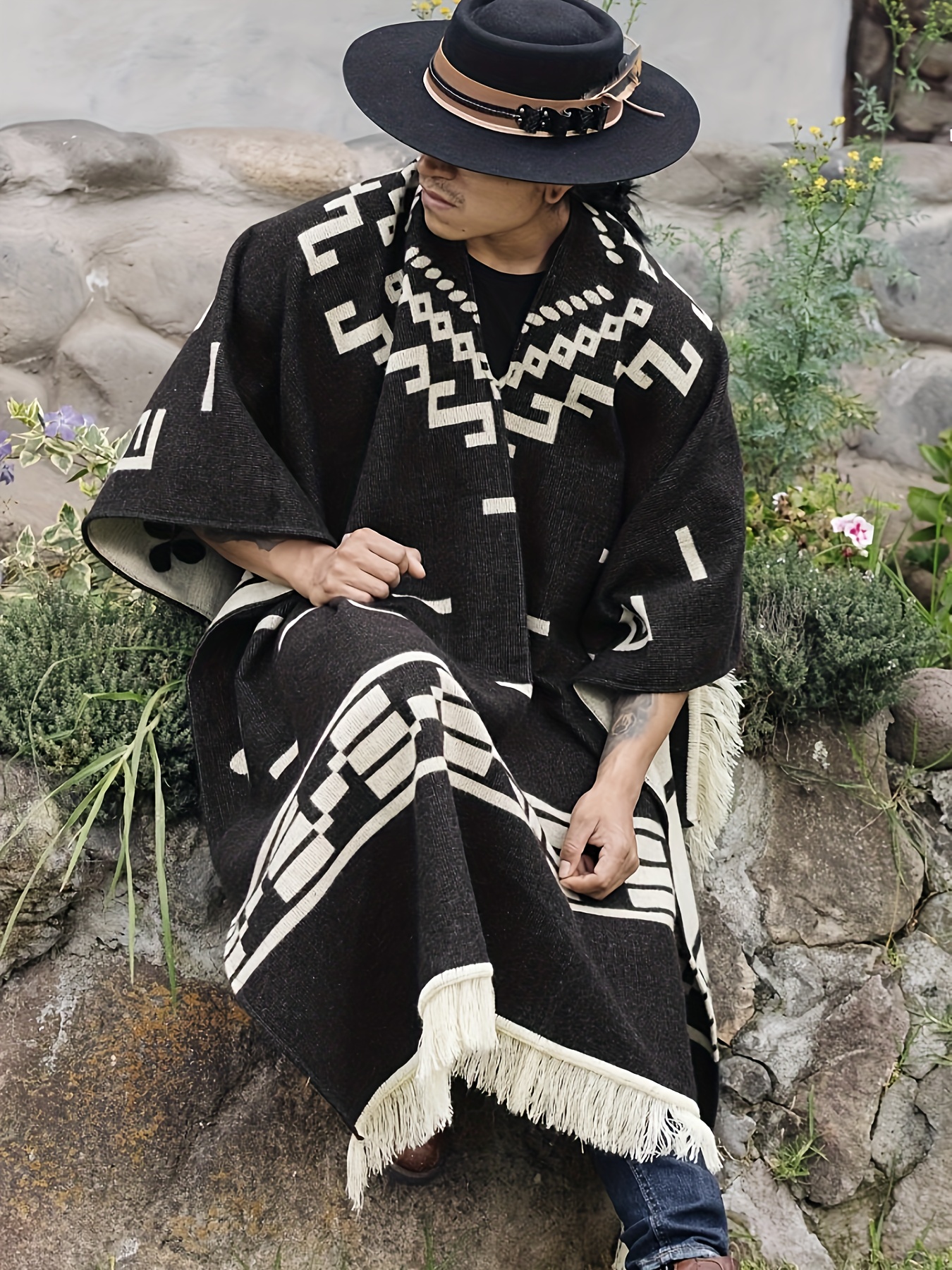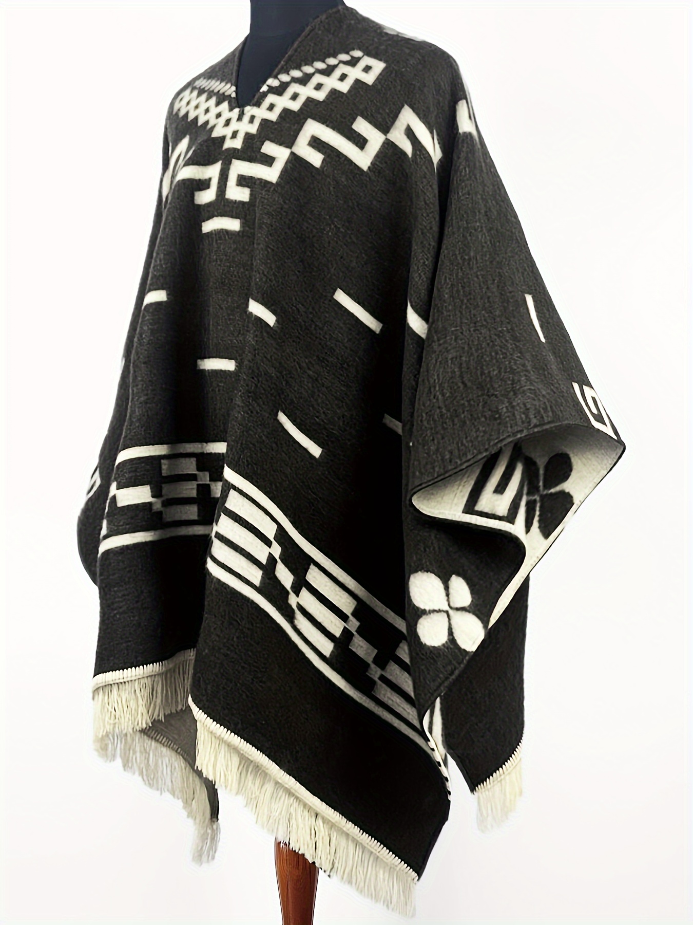 Casual V-Neck Tribal Pattern Poncho with Tassels - Polyester & Acrylic Blend, Non-Stretch Woven Fabric, Fall/Winter Warmth - Western Bandit Inspired Cape for Outdoor Adventures and Shopping