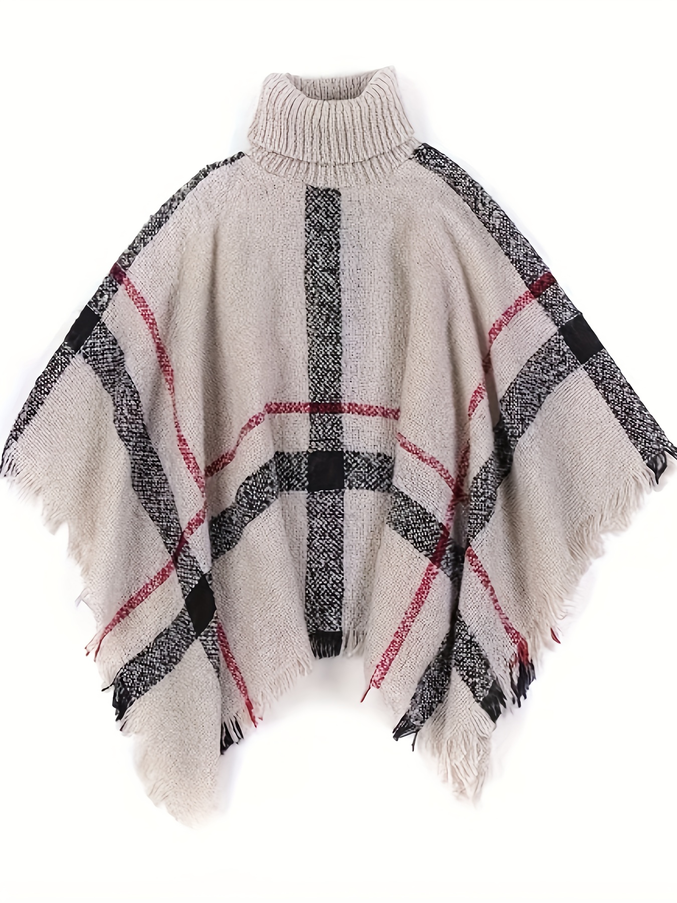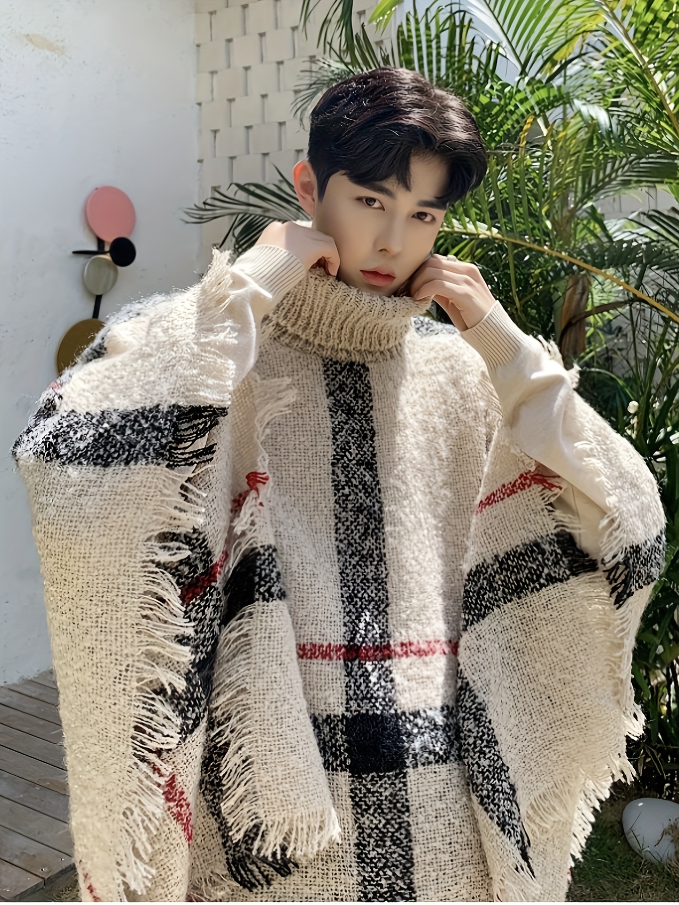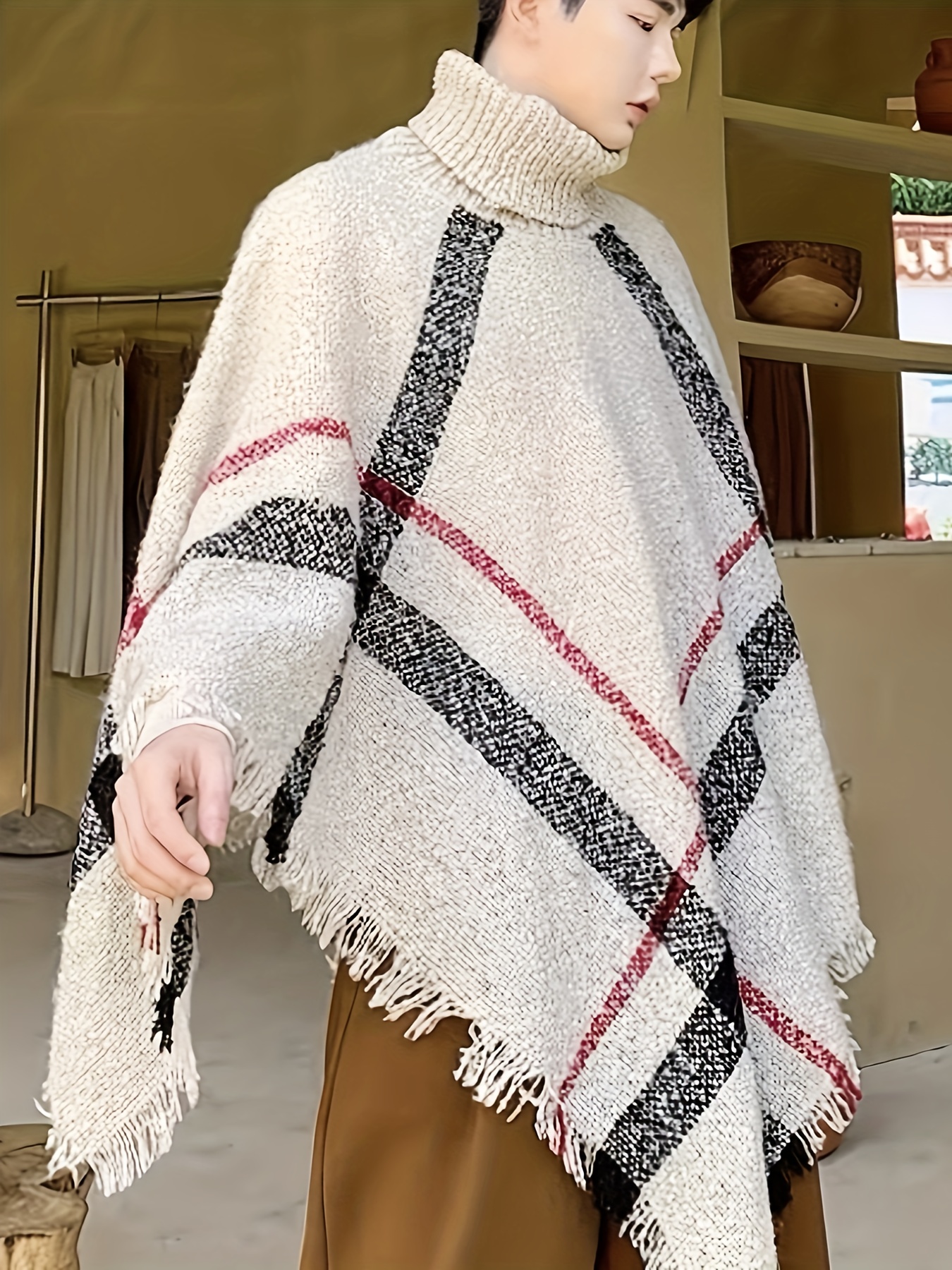 Men's Casual Plaid Tassel Shawl Sweater - Cozy Knit Pullover with High Neck, Loose Fit, Non-Sheer for Fall/Winter | Soft Acrylic, Machine Washable